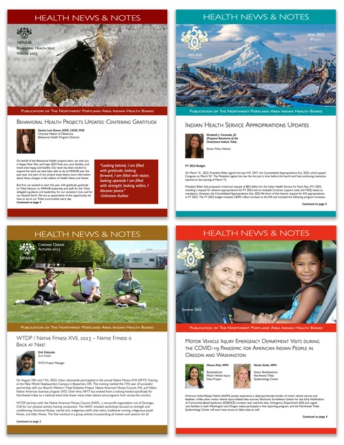 When NPAIHB hired me, my first directive was to improve the look of their long-standing publication, Health News & Notes. I created a simple layout and seasonal color system for their quarterly newsletter and added an email newsletter for the in-between months. The result was a clean and easy-to-read publication filled with the latest Northwest Native policy and public health news.